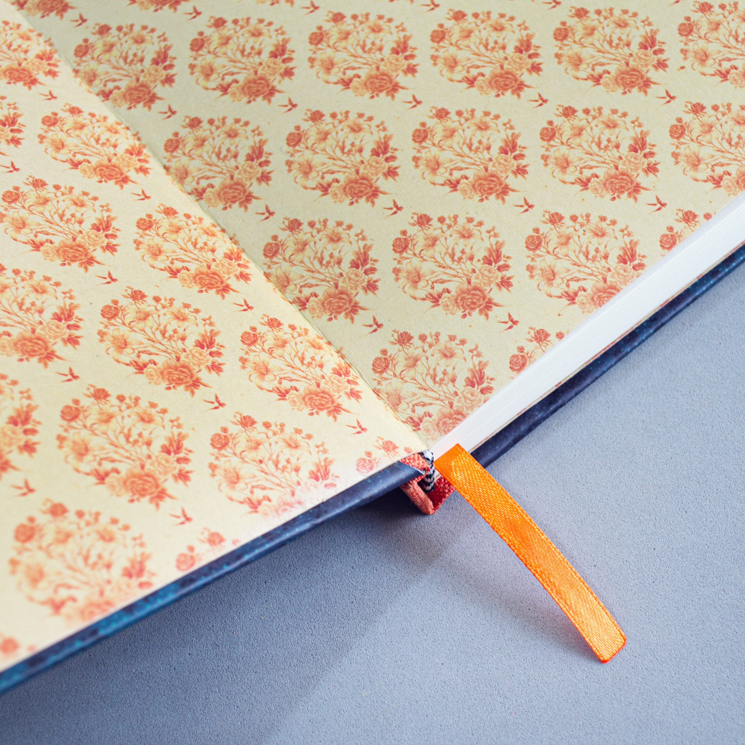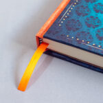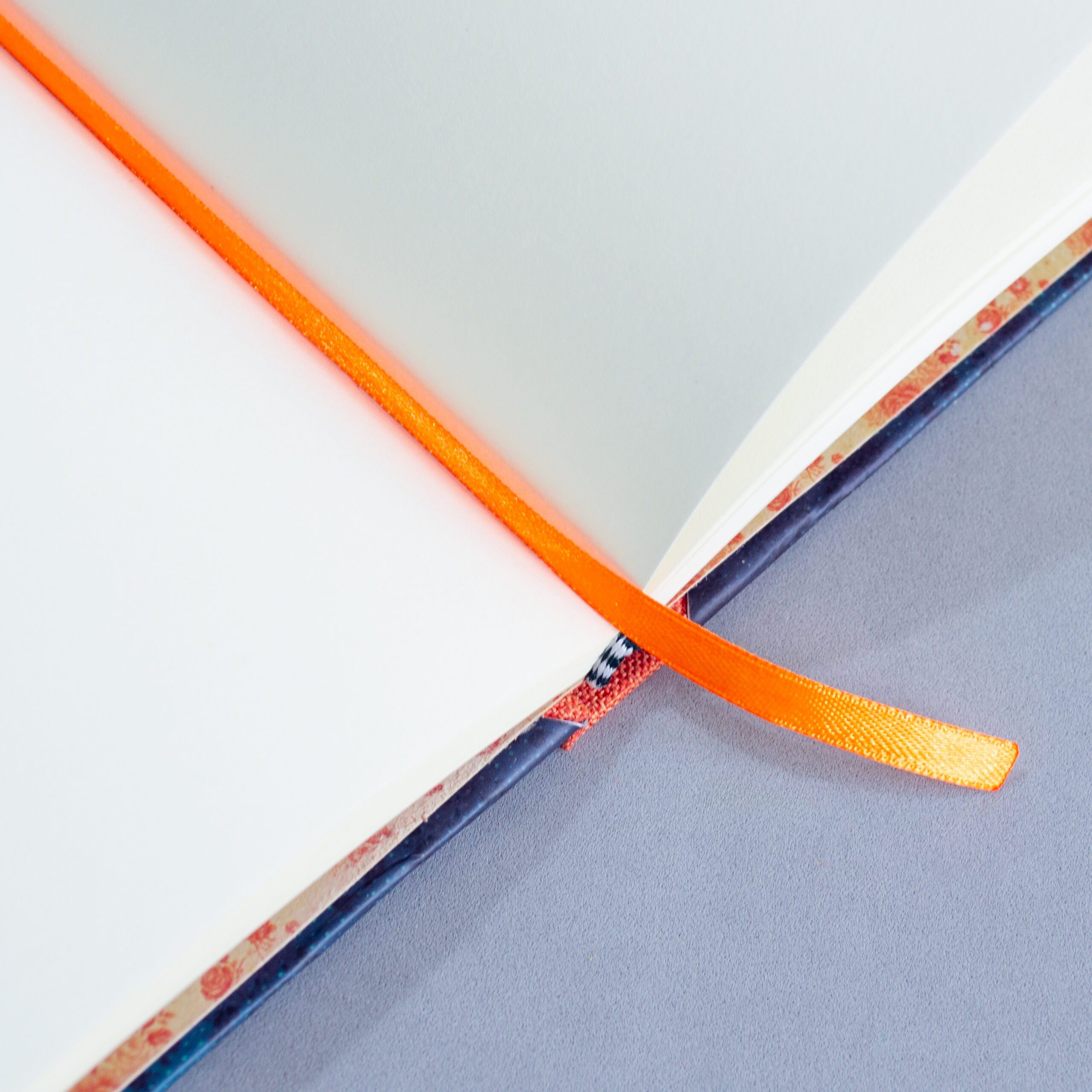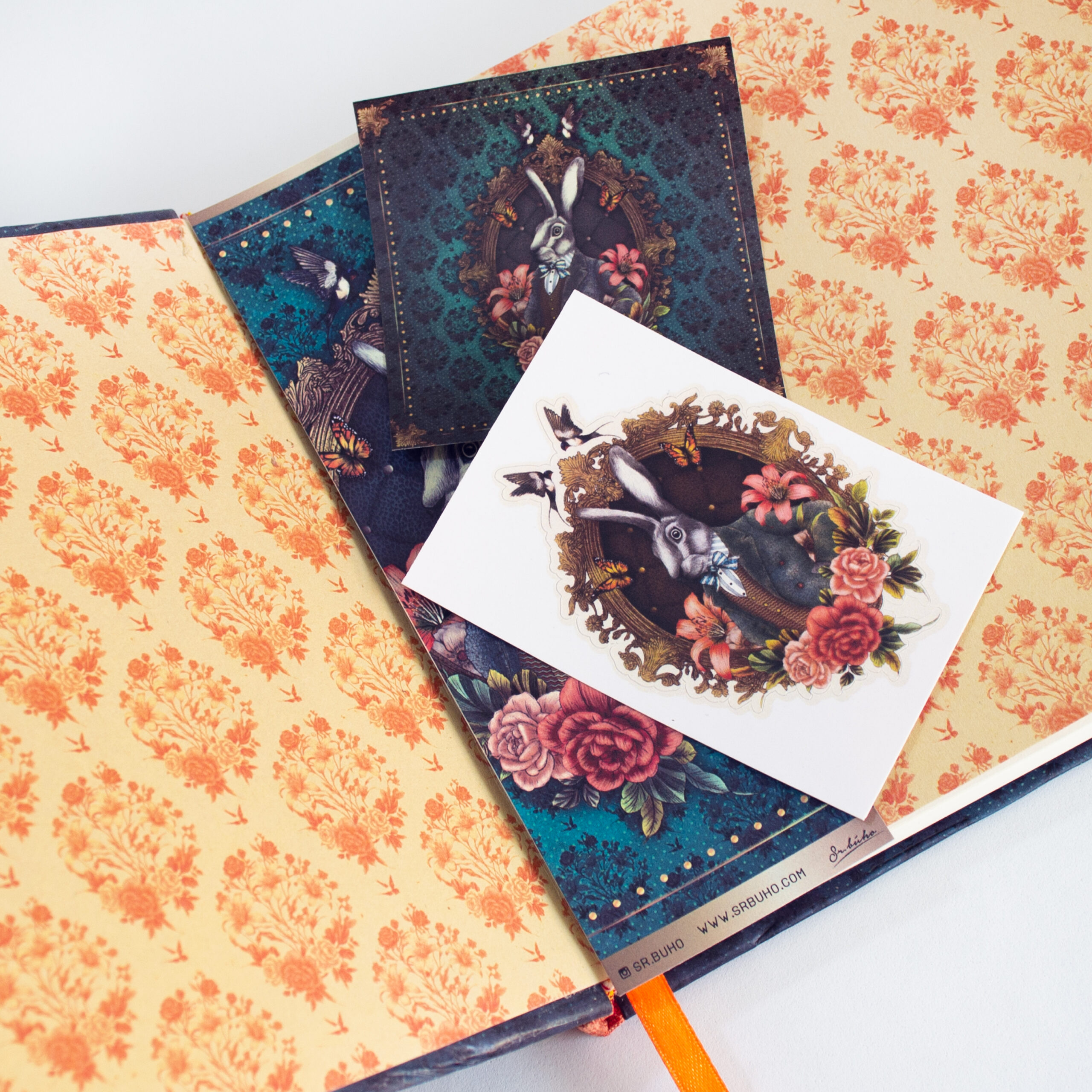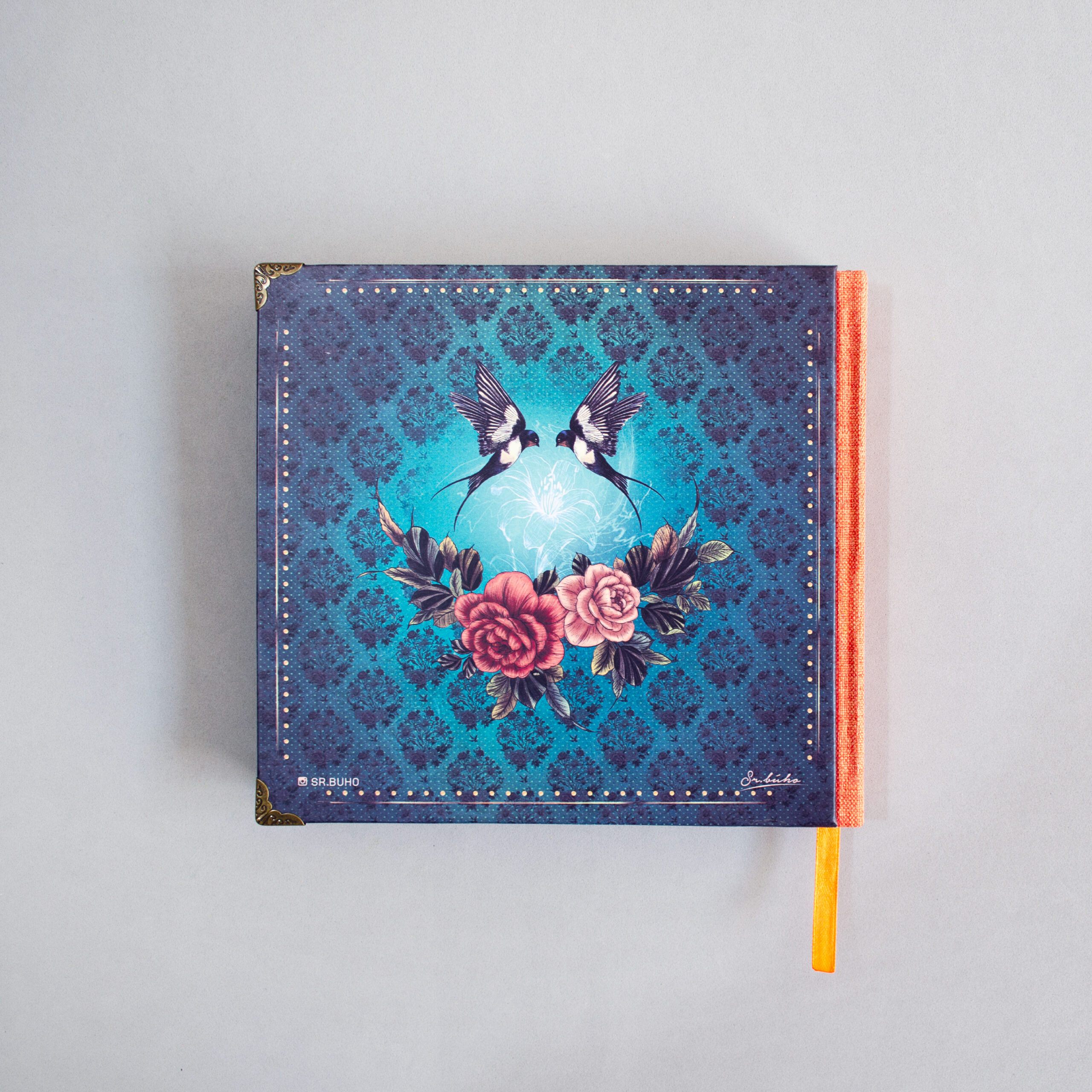 Libreta tapa dura. Plastificado mate. Lomo en tela. Equinas con acabado metálico. Costura Francesa manual. Cinta separadora. Papel color crema 90gr./100 hojas. Impresión Digital. Puedes trabajar con lápices de color, grafito, esféros o rapidógrafos o úsala también para escritura.
